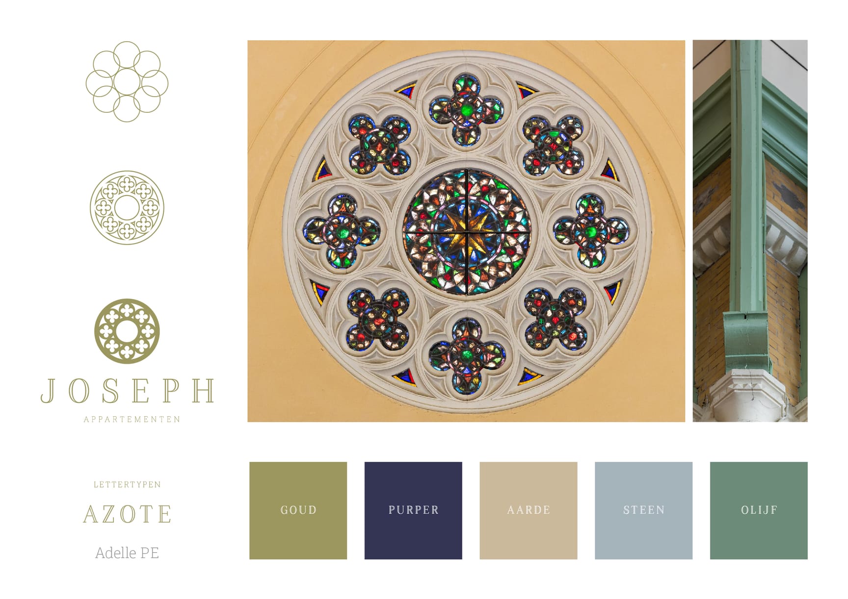 Het logo en de look & feel zijn direct geïnspireerd op de kerk zelf. Het beeldmerk is opgebouwd uit negen cirkels, verwijzend naar de negen koopappartementen én naar het rozet van glas in lood dat zo kenmerkend is voor de Sint-Josephkerk. Een subtiele, symbolische vertaling van architectuur naar identiteit. Het kleurenpalet is ingetogen en stijlvol, met warme tinten. Kleuren die ook terug te vinden zijn in de karakteristieke elementen in de kerk. Een eerbetoon aan de historie en ambacht.