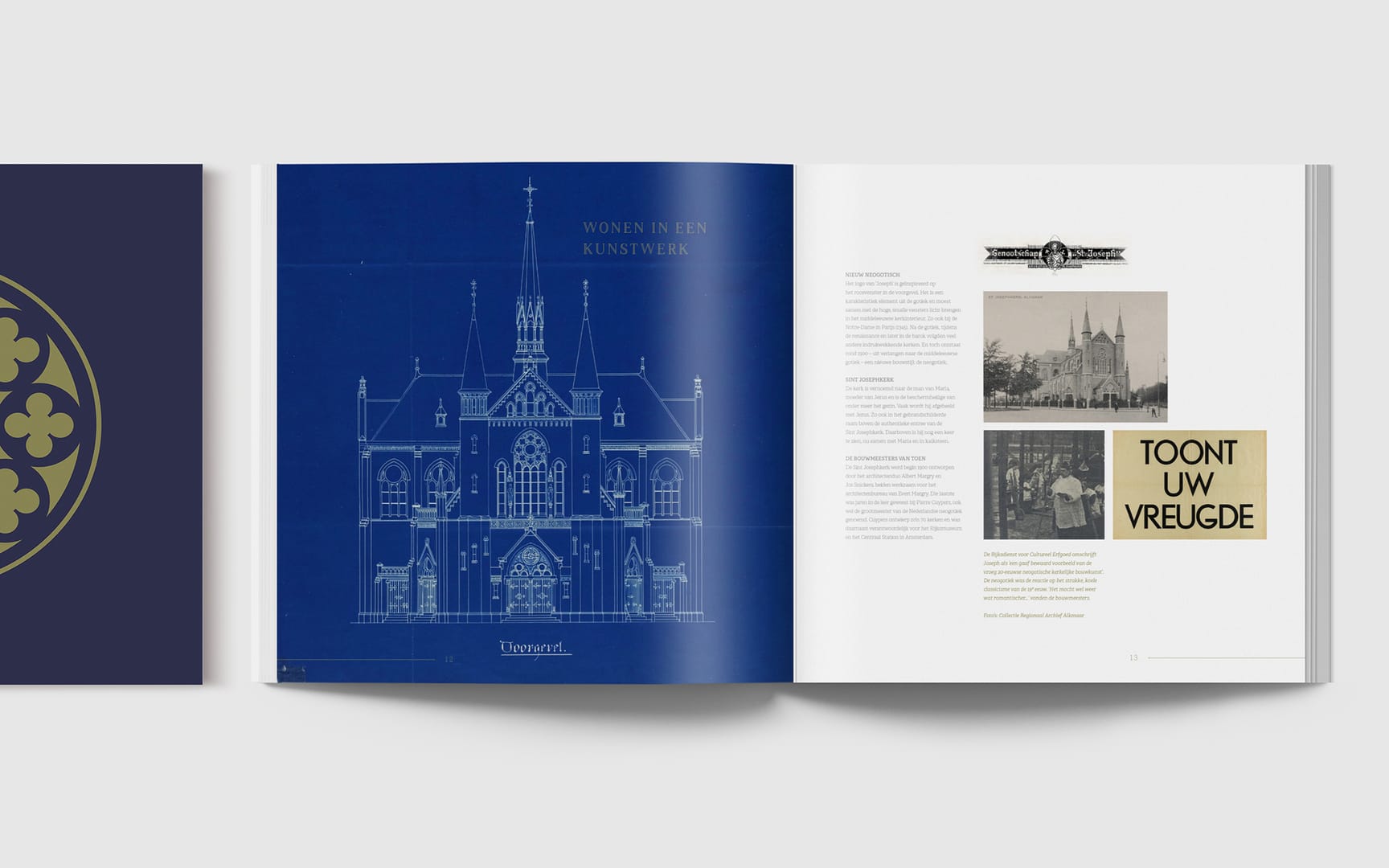 Het logo en de look & feel zijn direct geïnspireerd op de kerk zelf. Het beeldmerk is opgebouwd uit negen cirkels, verwijzend naar de negen koopappartementen én naar het rozet van glas in lood dat zo kenmerkend is voor de Sint-Josephkerk. Een subtiele, symbolische vertaling van architectuur naar identiteit. Het kleurenpalet is ingetogen en stijlvol, met warme tinten. Kleuren die ook terug te vinden zijn in de karakteristieke elementen in de kerk. Een eerbetoon aan de historie en ambacht.