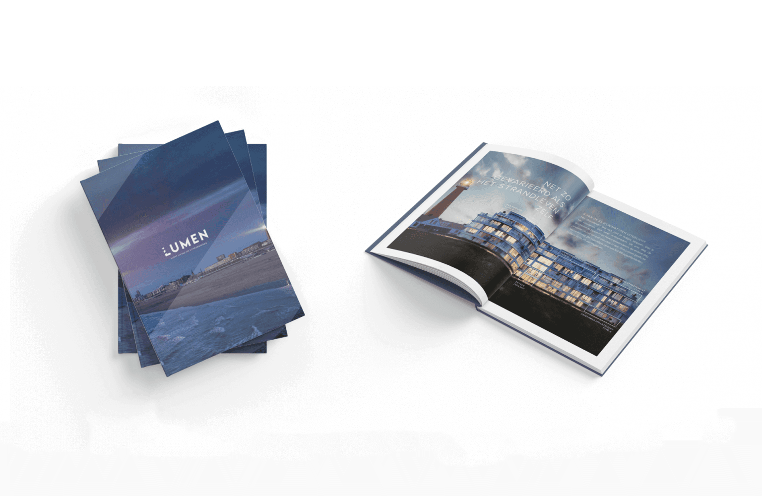 Toen het project na verloop van tijd klaar was voor de promotie van de verkoop, kozen we bewust voor een frisse herpositionering. Vanuit het bestaande concept werd het project omgedoopt tot Lumen: de eenheid van licht. Een korte, krachtige naam die verwijst naar de vuurtoren, de locatie aan zee en het ruimtelijke karakter van het wonen.