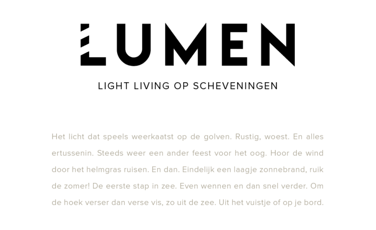 Lumen is een woonproject aan de Vuurtorenweg in Scheveningen, direct aan zee. Vanaf de eerste fase ontwikkelden wij het merk, het communicatieconcept en de visuele identiteit, met licht en zintuiglijke beleving als uitgangspunt.